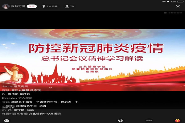 学习内容主要分为三个部分。首先由左雨琪同学带领大家学习习总书记重要讲话。在疫情期间,习近平总书记始终高度重视,多次召开会议、多次听取汇报、做出重要指示,始终要求各级要把人民群众生命安全和身体健康放在第一位。习总书记强调,疫情就是命令,防控就是责任,各级要增强“四个意识”、坚定“四个自信”、做到“两个维护”。而后左雨琪同学通过分析疫情防控工作的部署,带领社团成员感受我国强大的制度优势。各部门多措并举,及时地建立完整的应对机制,出台并落实救治费用补助政策、制定疫情防控指南、统筹协调医疗机构、引导舆论正向发展。不仅为抗击疫情贡献着自己的力量,更为抗击疫情提供健全有序的制度支撑。最后,左雨琪同学针对“面对时代大任,我们应该怎样做”向大家提出了几点建议。提出在疫情期间,我们要积极配合家乡社区、街道、政府进行的防疫工作,尽自己所能发挥青年力量。作为老员工要树立信仰用信仰为青春定向,用知识为青春赋能,努力奋斗用奋斗为青春添彩。