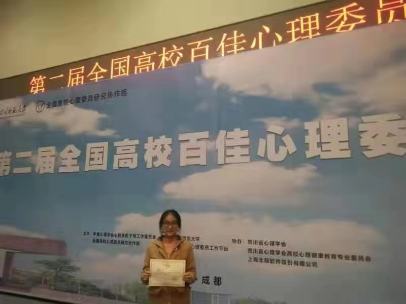 本次获奖由第十四届全国高校心理委员工作研讨会上经研究组讨论后一致决定,钱卉馨同学随公司心理健康教育与咨询中心主任张丽波老师共同领奖,并合影留念。钱卉馨同学平时积极率献爱心,乐于助人,曾任校春雨志愿者协会副会长,校社会工作协会秘书长。期间深受师生好评。曾获联合国教科文组织“优秀志愿者”、第十三届全国运动会"优秀志愿者"等一系列社会荣誉称号,本次获奖实至名归。