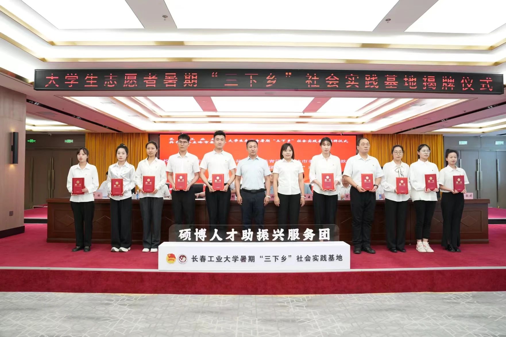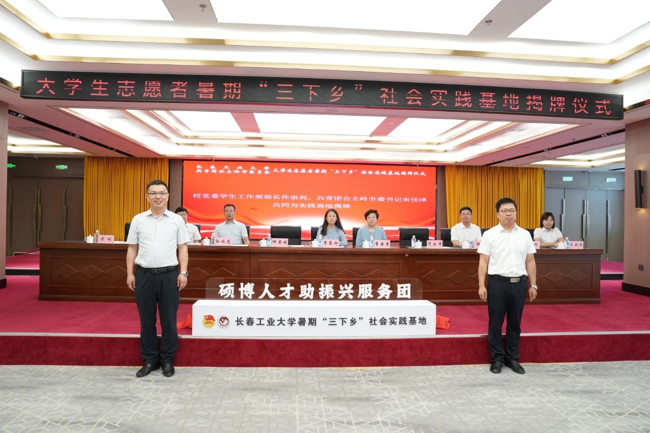 集团与共青团公主岭市委员会共建社会实践基地暨“硕博助振兴计划”揭牌仪式在公主岭市举行。公司党委副书记李东玲教授讲话,公主岭市委副书记李云香致欢迎辞;公司党委员工工作部部长仲崇利、共青团公主岭市委书记宋佳泽共同为实践基地揭牌;公司党委研究生工作部部长孙兆龙、共青团公主岭市委副书记王歆婷共同为“硕博人才助振兴计划”团建指导员颁发聘书;公主岭市河南街道团工委书记张敬昊代表公主岭市各乡镇街道讲话;“硕博人才助振兴计划”团建指导员聂子航代表公司团建指导员进行了发言。