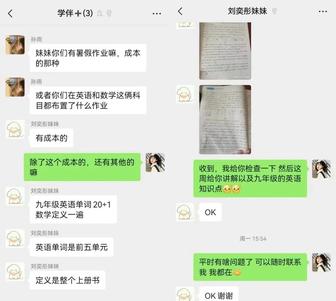 在这次“学伴+”志愿活动中,我的伴学对象是一名即将升初三的员工。对于她的教学,我们采用了多对一的方式,由我来负责讲解英语。在英语方面,我给他讲解了暑假作业里的错题以及重要知识点。此外,讲授了九年级的新课,使其提前学习新知识。在了解她的单词背诵和语法方面掌握情况,我为她制订了背诵计划,也会定期进行检查背诵情况。看到她一点点进步,我也由衷为她感到高兴。
