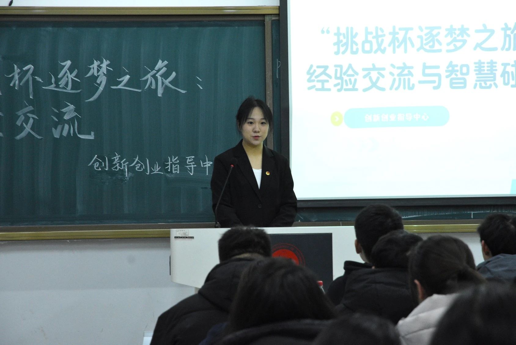 随后,“挑战杯”省一等奖获得者曹馨月同学登台,为大家带来了一场干货满满的竞赛经验分享。曹馨月同学深入剖析了竞赛的主题内涵、详细解读了具体要求,并点明其独特之处,使同学们对竞赛有了更为清晰的认知框架,为同学们带来了一场极具启发意义与借鉴价值的交流盛宴,也进一步点燃了同学们参与挑战杯的热情之火。
