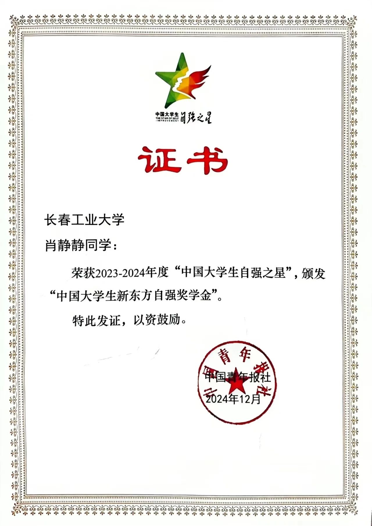 喜报!公司肖静静同学获得2023-2024年度“中国老员工自强之星”荣誉称号