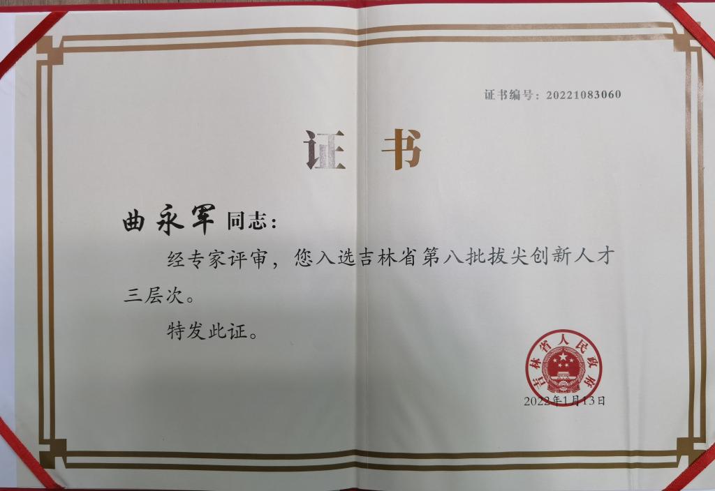 近日,公司教师曲永军同志经专家评审,成功入选吉林省第八批创新拔尖人才三层次。