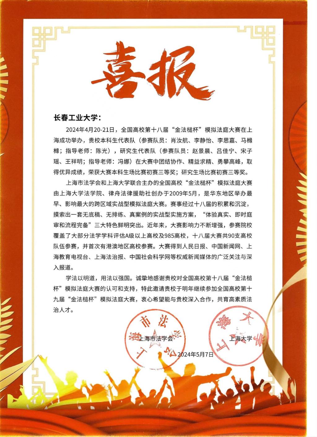 近日,上海市法学会、上海大学向公司发来喜报,祝贺公司本科生、研究生代表队在全国高校第十八届“金法槌杯”模拟法庭大赛中分别荣获初赛三等奖。