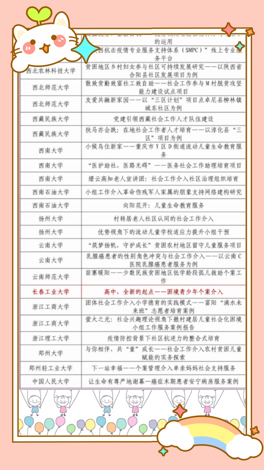 由公司陶宇教授指导、2020级社工专硕杨爽参与撰写的案例《高中,全新的起点——困境青少年个案介入》入选全国百强案例。在全国152所高校中,有62所高校提交的案例获此殊荣。