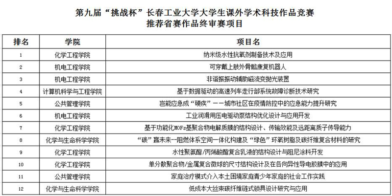 本次大赛,公司共选送24项作品,在第一轮初赛中,《萨提亚家庭治疗模式介入农村留守儿童偏差行为服务计划》等4个项目胜出;在第二轮半决赛比赛中,《“蜂媒”人参杂交种规模化生产技术集成》等3个项目胜出;在公司决赛中,公司参赛项目《岂能应急成“硬疾”—城市社区在疫情防控中的应急能力提升研究》、《家庭治疗模式介入本土困境家庭青少年家庭的社会工作实践》分别取得第5名和第11名的好成绩,文科项目仅此两项入围省赛。