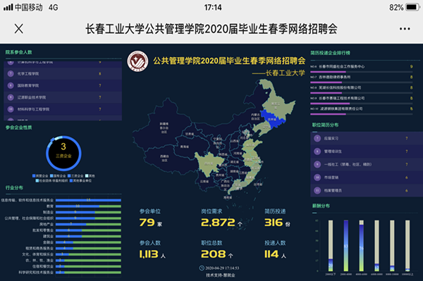 此次招聘会企业呈现出地域覆盖广、层次质量高、沟通联系快等几大特点,招聘会共邀请到自14个省份的79家企业参会,其中省内优质企业41家,国有企业5家,三资企业3家,涉及信息传输、软件和信息技术服务业、教育、公共管理、社会保障和社会组织、文化、体育和娱乐业、科学研究等13个专业,提供就业岗位需求2872个。