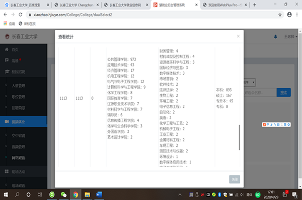 EMC易倍全体师生积极参与此次网络招聘会,截止4月29日17:00,共有1113名师生参与到此次招聘会中。投递简历316份,初步达成就业意向7人。