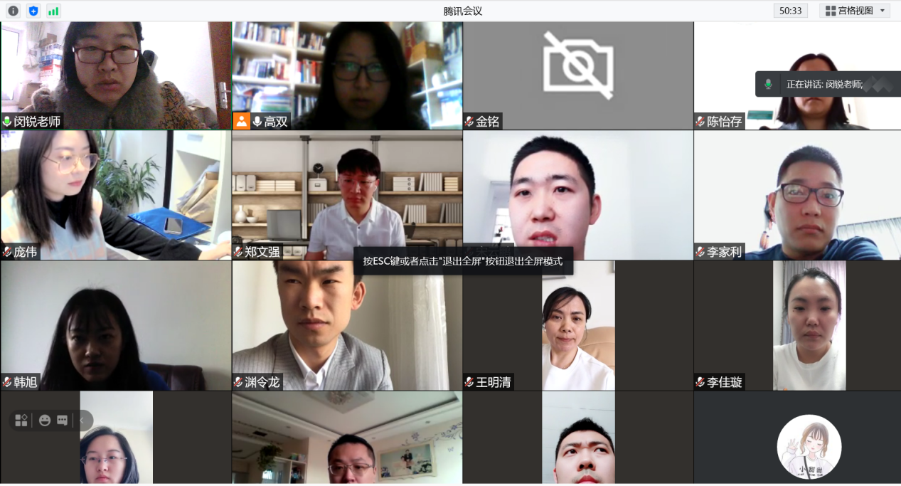此次预答辩共155名毕业研究生参与,整体效果良好,网络流畅,音频清晰,全程未出现卡顿情况。所有参加预答辩的员工,先自述4分钟,主要包括论文主要观点和论文目前存在的问题,并由答辩组老师用10-15分钟时间给每位员工提出论文进一步修改的建议。整个答辩过程中,答辩组老师根据员工撰写的论文提出了切实可行的建设性建议,同时,员工对于答辩组老师提出的建议表示认可,并做了认真记录。答辩结束后,员工们在群里感谢老师们提出的建议与鼓励,均表示尽早与导师沟通,认真、严谨、负责地努力完善论文,展现出满满的信心。