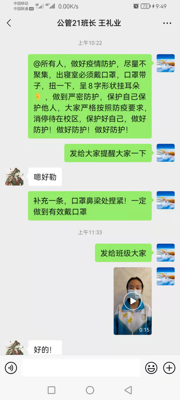 每个人按规定做好防疫检测、出行等,是出寝室必须带好口罩,一定做好防护。尽量别聚集,能少出去就少出去,能少接触人就少接触人,能少去一次超市就少去一次超市。季节交替,做好衣物增减,千万别生病,别感冒。还特别贴心嘱托正确的口罩佩戴方法,口罩带子,扭一下,呈8字形状挂耳朵。