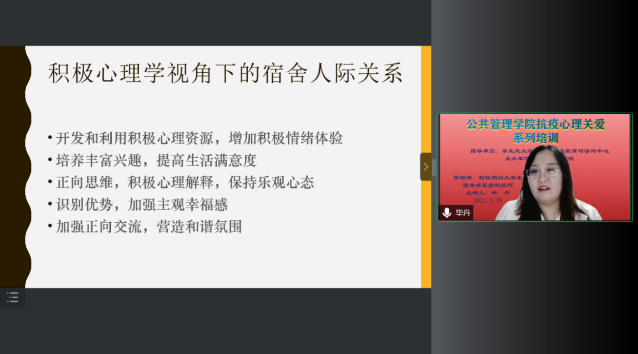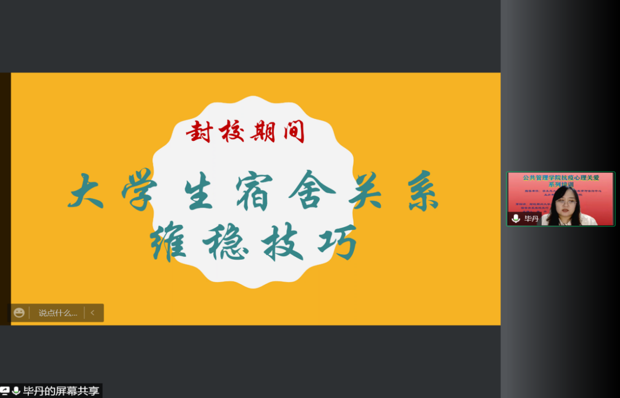 2022年3月20日晚,EMC易倍举办首轮抗疫心理关爱系列讲座第四讲。本次讲座以“封校期间老员工宿舍关系维稳技巧”为主题,主讲人是社会工作系的毕丹老师。