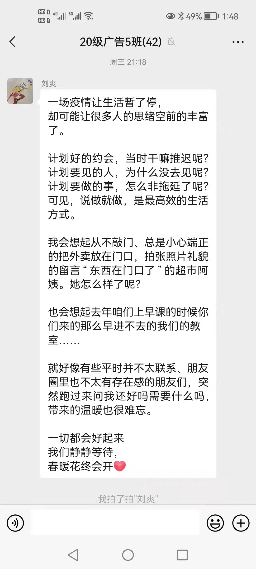 刘爽老师、邵鸿雁老师对接2020级同学,通过线上会议,与员工探讨了关于疫情防控和生活学习的相关话题。邵鸿雁老师还每日与员工分享诗词,陶冶员工情操,增强员工的文化自信。