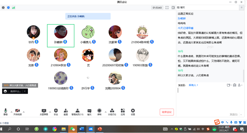 毕丹老师给“横班纵组”同学布置了查阅和梳理有关疫情期间社会工作服务的相关文献的作业,并通过腾讯会议召开组会,请每位同学分享阅读文献的收获和体会。毕老师还邀请了已经毕业的员工参会,这些员工一直工作在社区抗疫一线,有社工也有志愿者,他们给学弟学妹们讲述了社区抗疫前线的情况,理清了在抗疫工作中社工和志愿者的区别,生动展现了当下社区社工和志愿者的实际工作状况。毕老师也为同学们分析了疫情当下人们会产生焦虑情绪的原因,并为员工如何消除不必要的焦虑情绪提供了心理辅导。