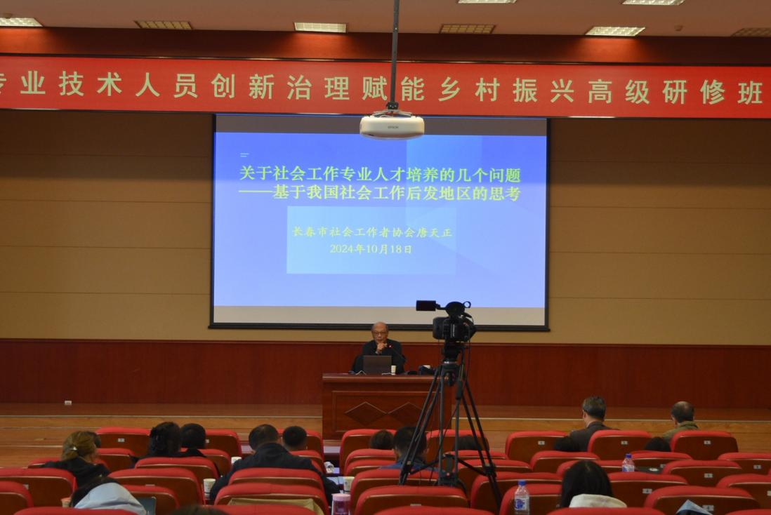 本网讯(通讯员:汤道化)10月18日下午,国家级专业技术人员“创新治理赋能乡村振兴”高级研修班活动在公司南湖校区学术报告厅继续进行。第八场主讲嘉宾特邀长春市社会工作者协会唐天正教授,他为学员们作了题为“关于社会工作专业人才培育的几个问题——基于我国社会工作后发地区的思考”的讲座。EMC易倍副经理冯娜教授主持讲座。公司党政班子成员、师生及研修学员百余人参加讲座。