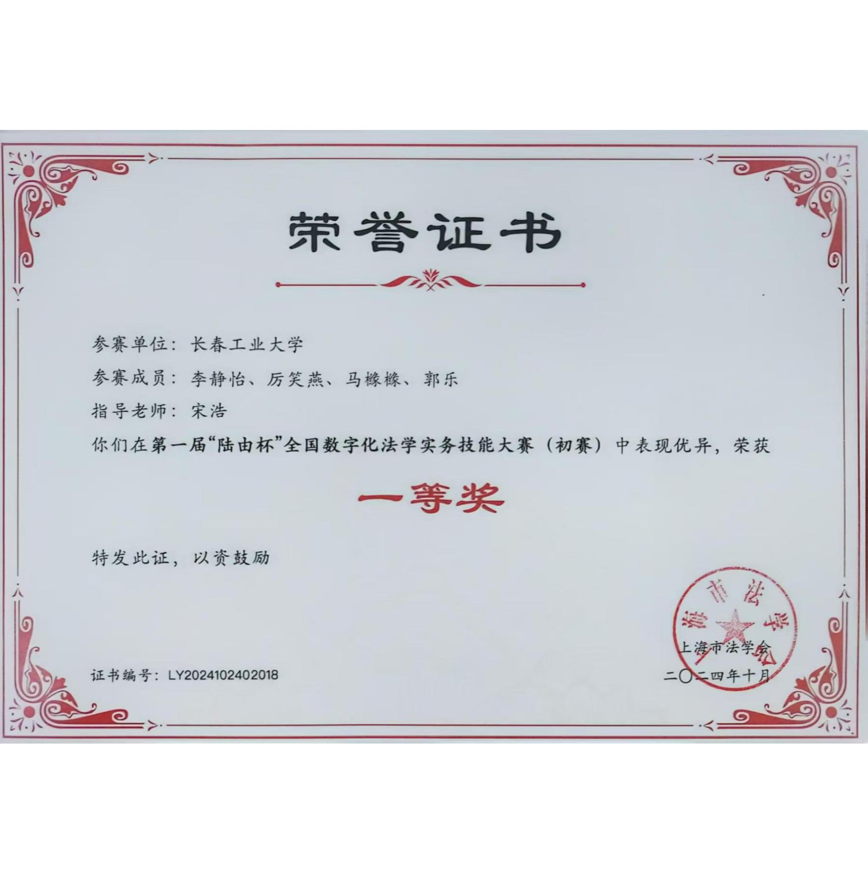 本网讯(通讯员 宋浩)2024年10月,第一届“陆由杯”全国数字化法学实务技能大赛在上海举办。在法学系主任宋浩老师指导下,公司法学专业本科生李静怡、厉笑燕、马橼橼、郭乐组成的代表队荣获一等奖。